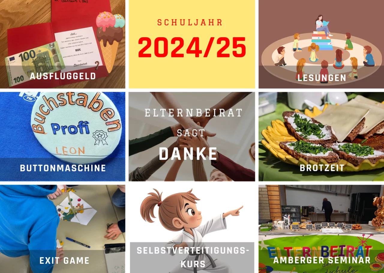 Der Elternbeirat bedankt sich ganz herzlich bei Euch allen! Danke für jede helfende Hand, alle Essensspenden, Hilfe bei Auf- und Abbau diverser Veranstaltungen. Wir konnten in diesem Jahr erstmals den Selbstbehauptungskurs wieder ins Leben rufen, haben das Amberger Seminar bewirtet, am Weihnachtsmarkt zum ersten Mal auch Gebasteltes von den Kindern verkaufen können, unser etabliertes EXIT Game (Edu Break Out) mit den Kindern gespielt, Lesungen für die Kinder initiiert und teils finanziert sowie 4x im Schuljahr eine gesunde BrotZeit für alle (!) Kinder der Grundschule finanziert und mit vorbereitet. Wir waren dafür sogar am Erdbeerfeld 🍓