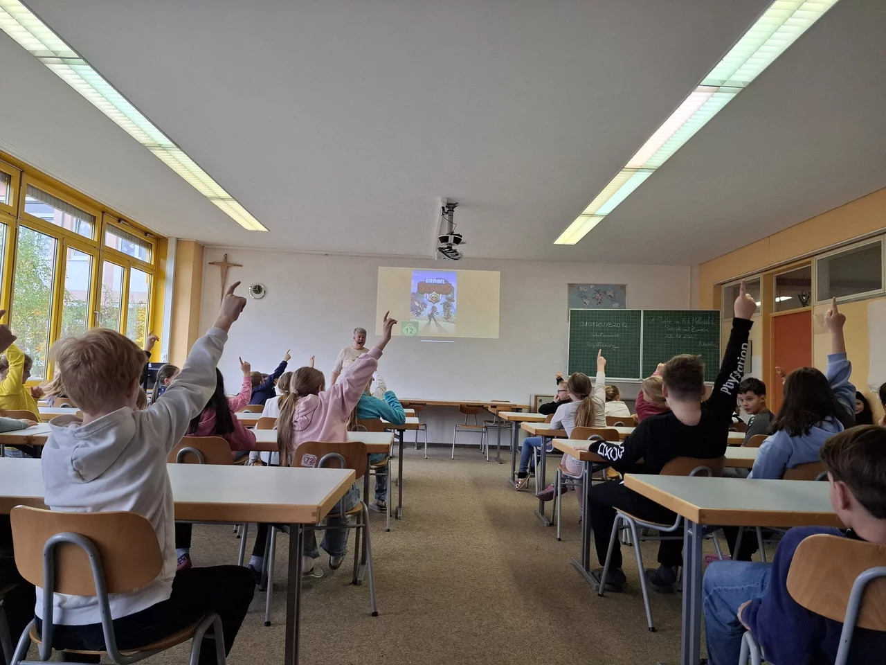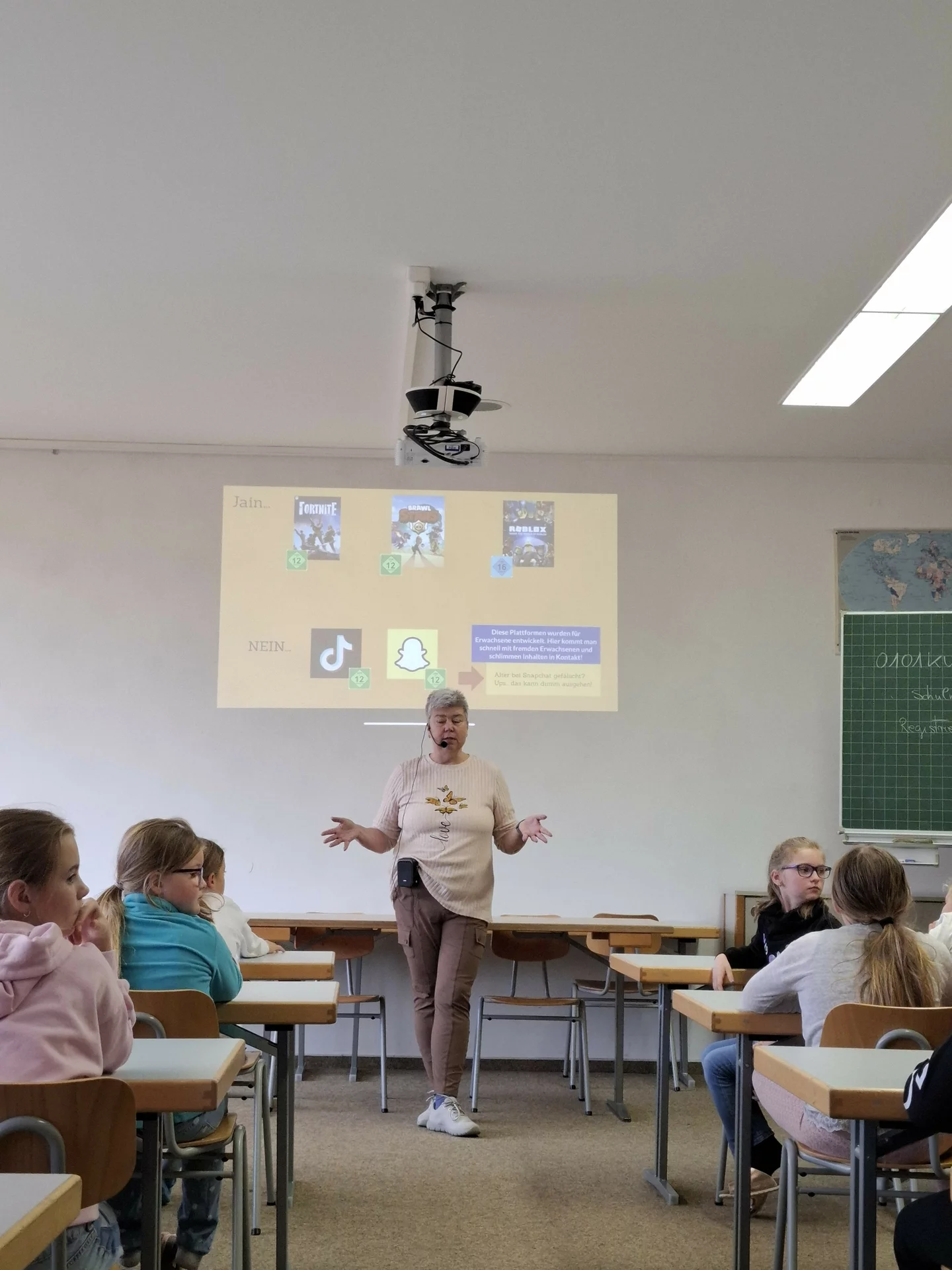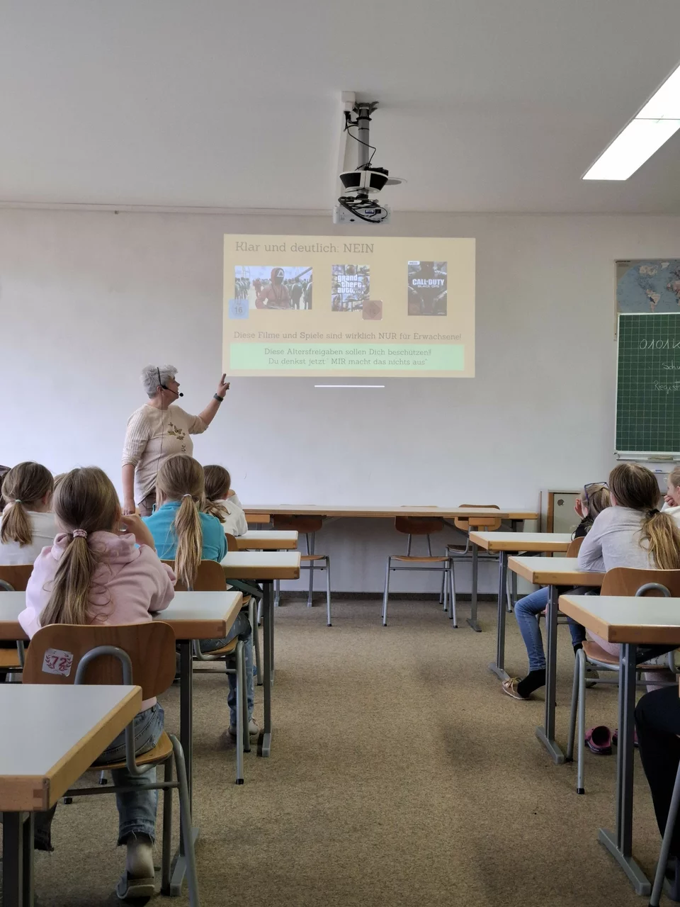 Am Dienstag, 28.10.2025, fand die Aktion „Clever ins Netz“ für die 4. Klassen statt. Die Kinder erhielten Einblick, was FSK überhaupt bedeutet und auch was die unterschiedlichen Altersfreigaben beinhalten. Die Schülerinnen und Schüler wurden sensibilisiert, wie man sich in Spielen verhält und welche Spiele ihrem Alter entsprechen. Auch diverse Spiele und Apps wurden mit den Kindern kritisch durchleuchtet. Besonders erschrocken waren die Kinder, dass man mit Hilfe der Map in Snapchat (diese App ist nicht für ihr Alter offen) sofort sehen kann, wo sich jemand bis auf das Klassenzimmer genau befindet. Ein weiterer Schwerpunkt des Vortrags war die Thematik des Chattens. Es wurde besprochen, wie man reagieren soll, wenn fremde Menschen in einem Spiel mit einem chatten möchten und zum Beispiel Bilder einfordern.
