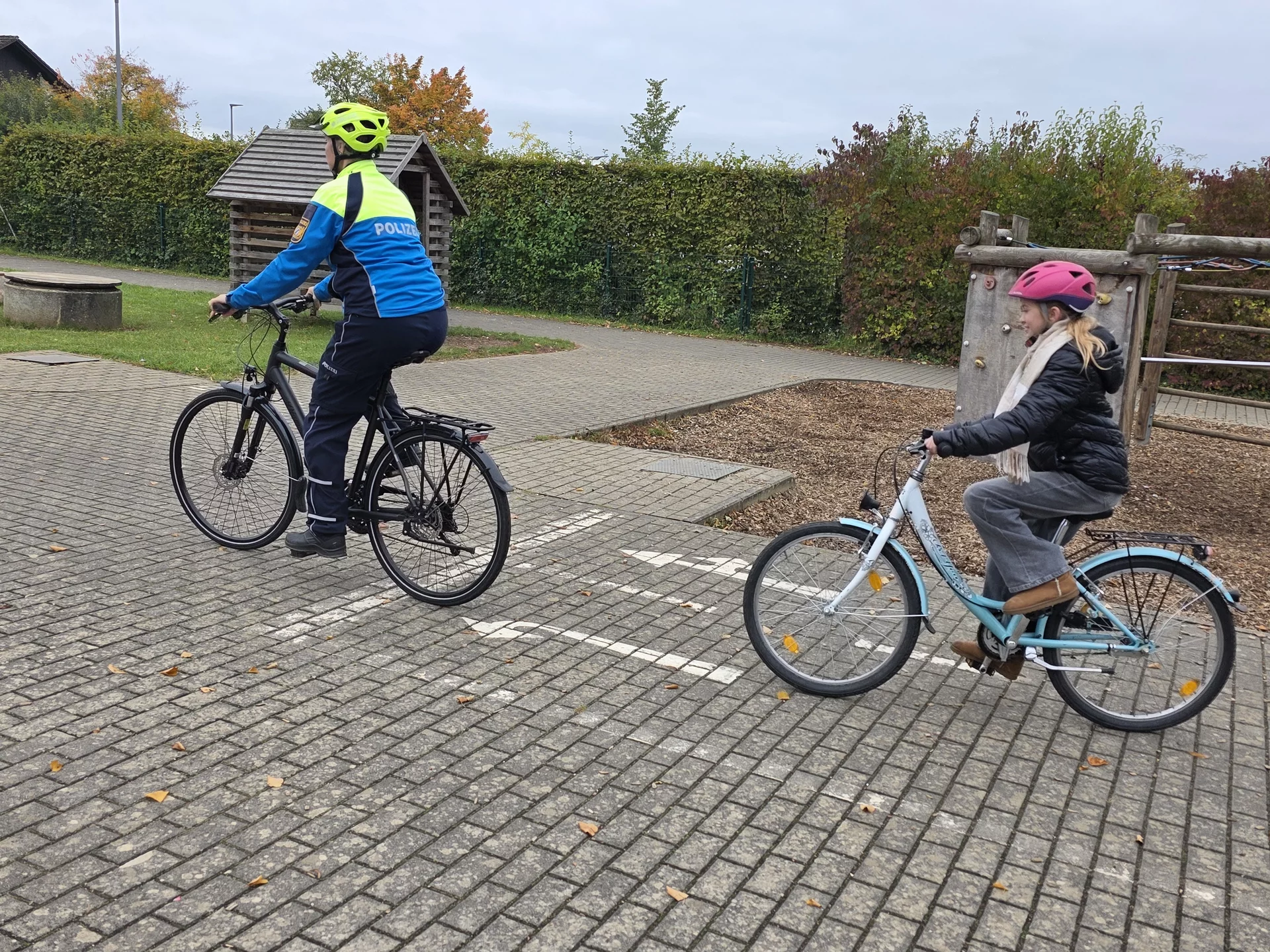 Die beiden Verkehrserzieher der Polizei unterrichten die Kinder der 4. Klassen auf dem Verkehrsübungsplatz der Grundschule und üben das richtige Losfahren, Vorbeifahren am Hindernis und das Linksabbiegen.