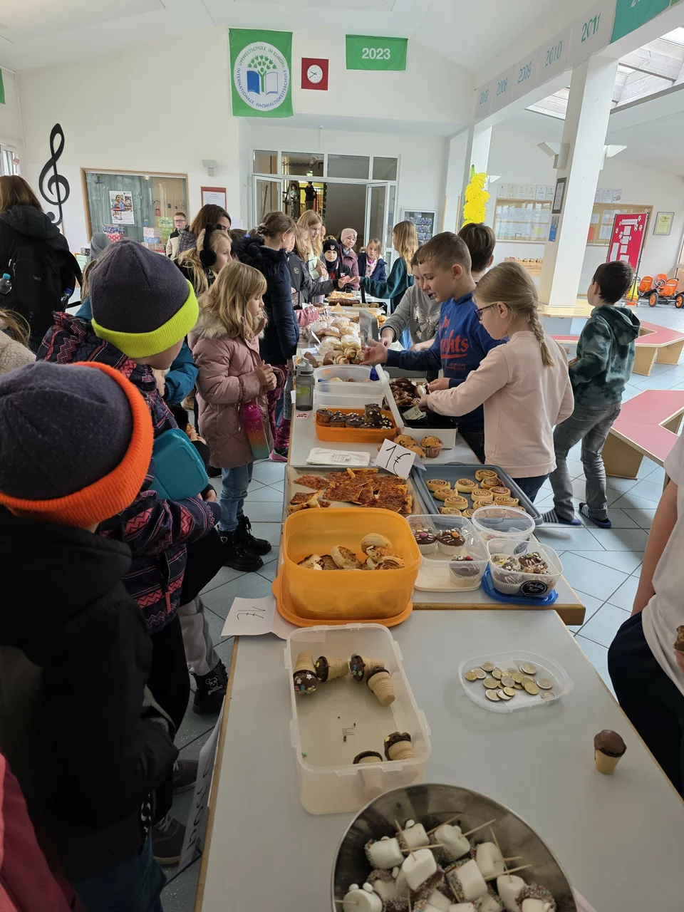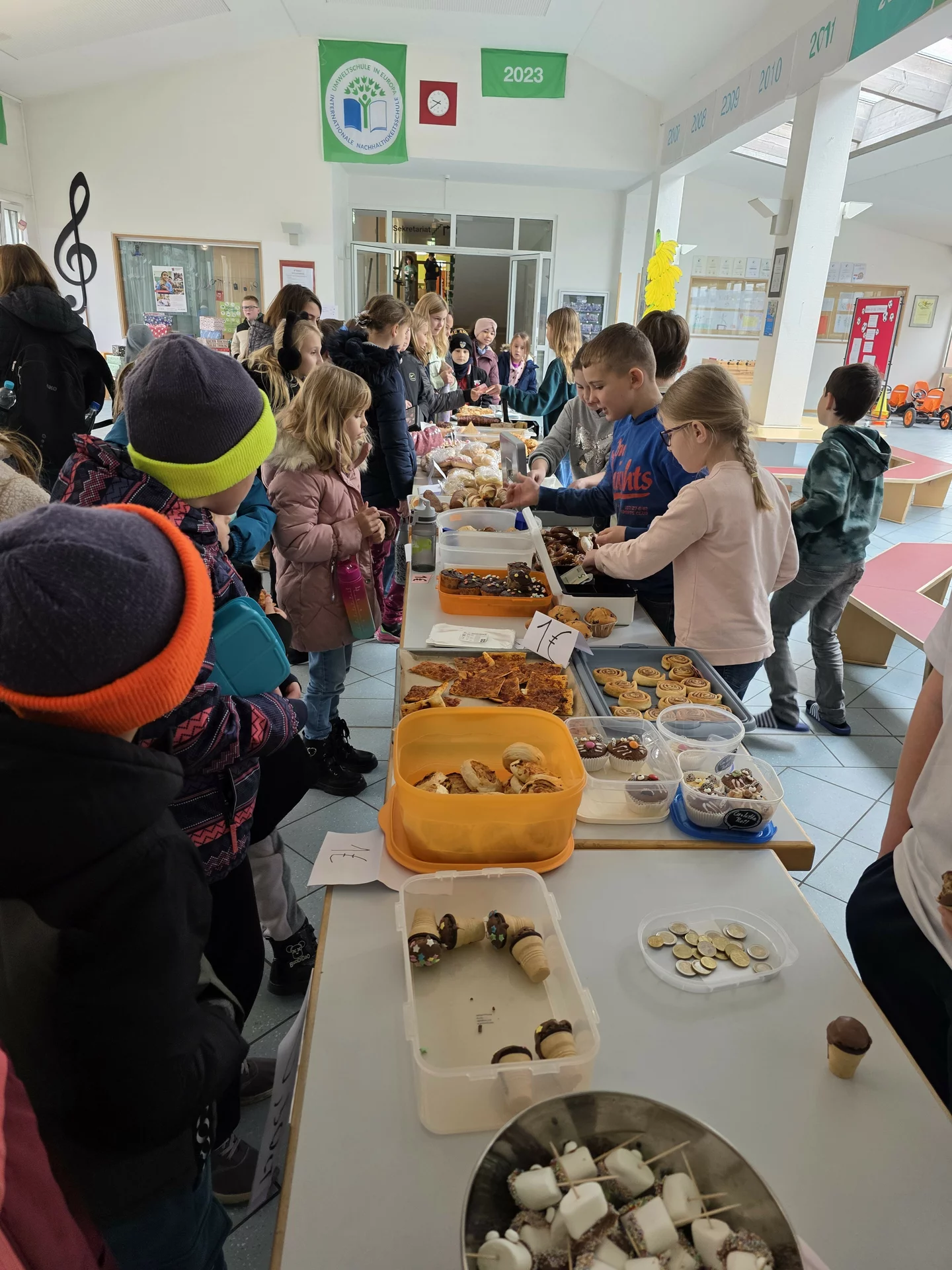Schülerinnen und Schüler zu. Jeder durfte sich zu Beginn der Pause am Buffet in der Aula kostenlos bedienen. Bis zum Ende der Pause war